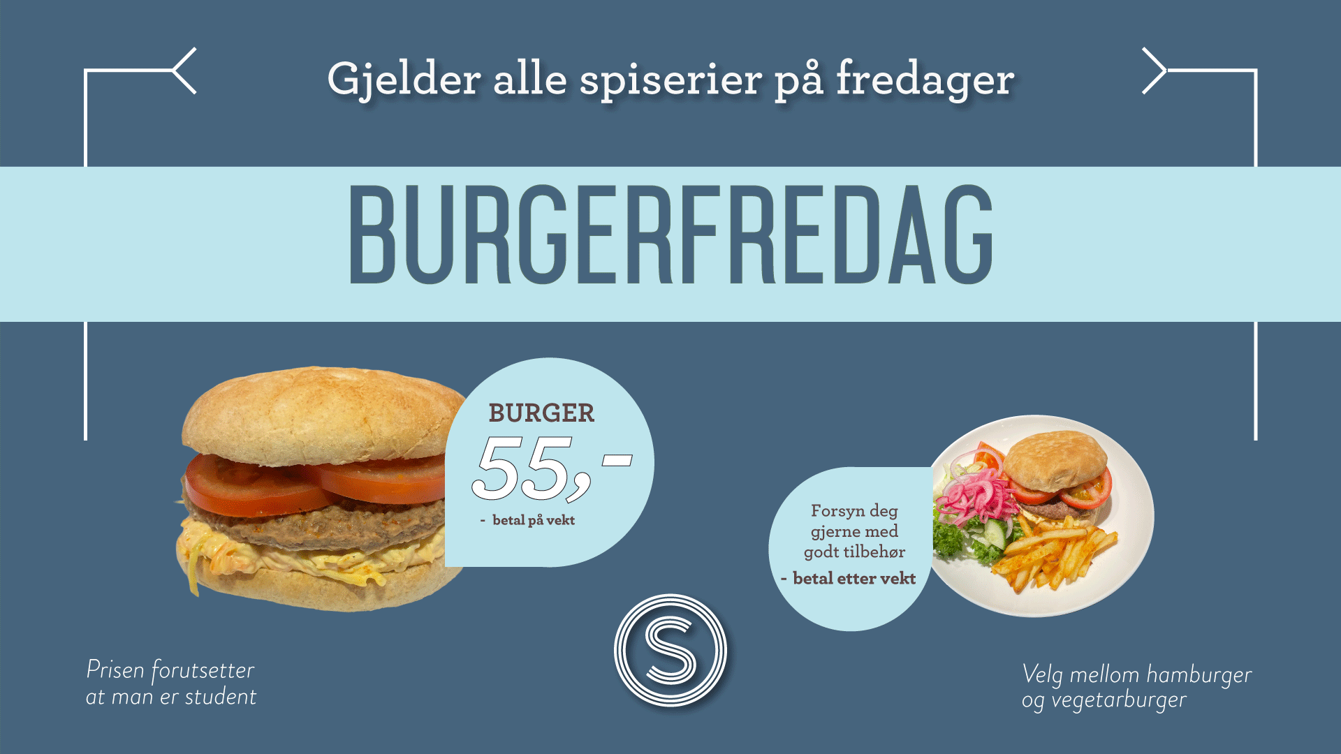 Hamburger or vegetarian burger with tomato and coleslaw – NOK 55. Just place your burger on the scale when paying – it won’t cost more than NOK 55.